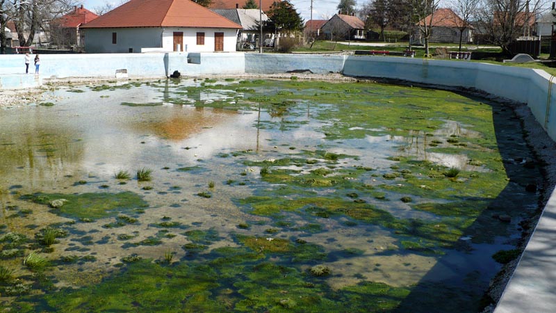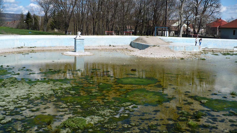 Hányatott sorsú fürdőkülönlegesség, a 19. században kezdték el kialakítani, fokozatosan fejleszteni. A virágzó fürdőhely gyógyvize a környékbeli bányászat hatására később elapadt. 1990.-ben karsztvízzel töltötték fel és évekig remekül működött. Mostanra megint felújításra szorul, üzemeltetése 2013. tavaszán - amikor a képek készültek - még kétséges volt. Az első képen „egy barátnőmmel” vagyok látható. Nem tudom hogyan lehetne kevésbé kétértelműen említeni Zoli barátom feleségét Katit, akikkel olyan sokat nyaraltunk már együtt – és remélem még sokszor fogunk is ?